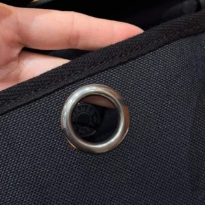 • Design highlights: Canvas-leather patchwork body, zippered back pocket, classic round metal button closure