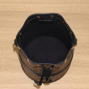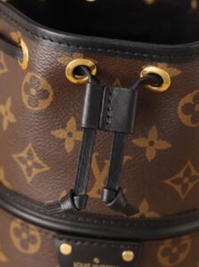 Color-Blocked Components: Black smooth calf leather (bag bottom, body strap, drawstring, main shoulder strap), firm and glossy, forming a classic contrast with the Monogram canvas, enhancing overall refinement.