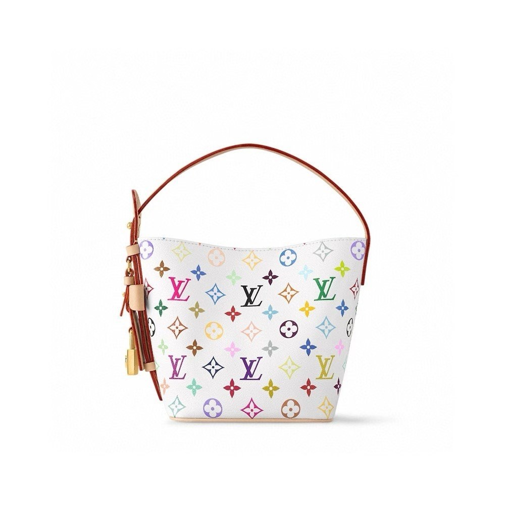 Louis Vuitton LV White Multicolor All in BB Bucket Bag, a collaboration with Takashi Murakami, is crafted from white multicolor Monogram canvas with colorful monogram patterns and natural cowhide trims, featuring a padlock and a detachable inner pouch.
