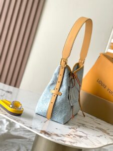 Crafted from classic Monogram debossed denim canvas, this Louis Vuitton vintage denim shoulder bag features natural cowhide leather trims, a detachable name tag, and coordinating drawstring details, exuding retro charm while offering daily practicality.