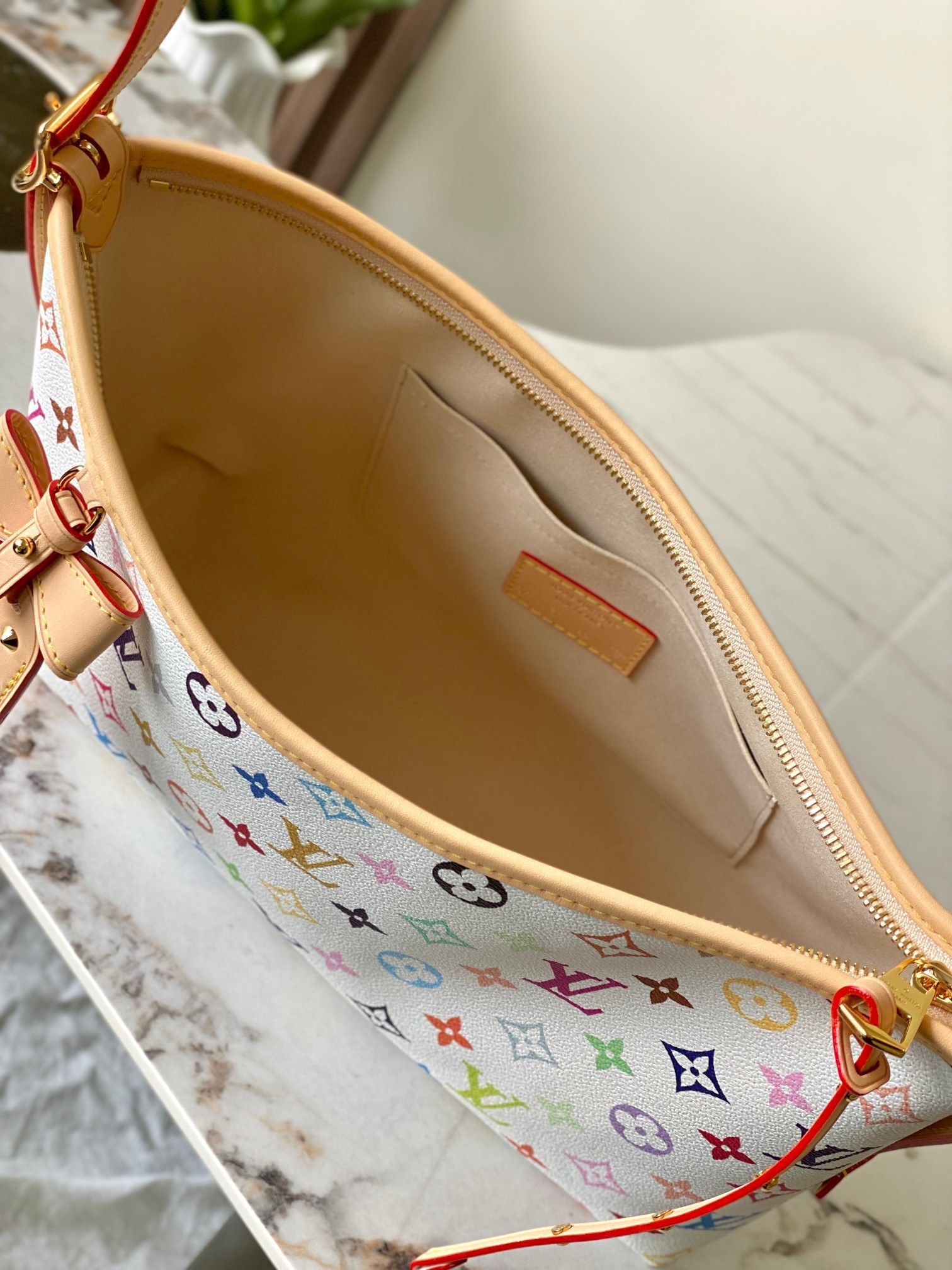 • Color: White base with multicolor Monogram print + natural cowhide color