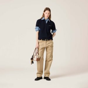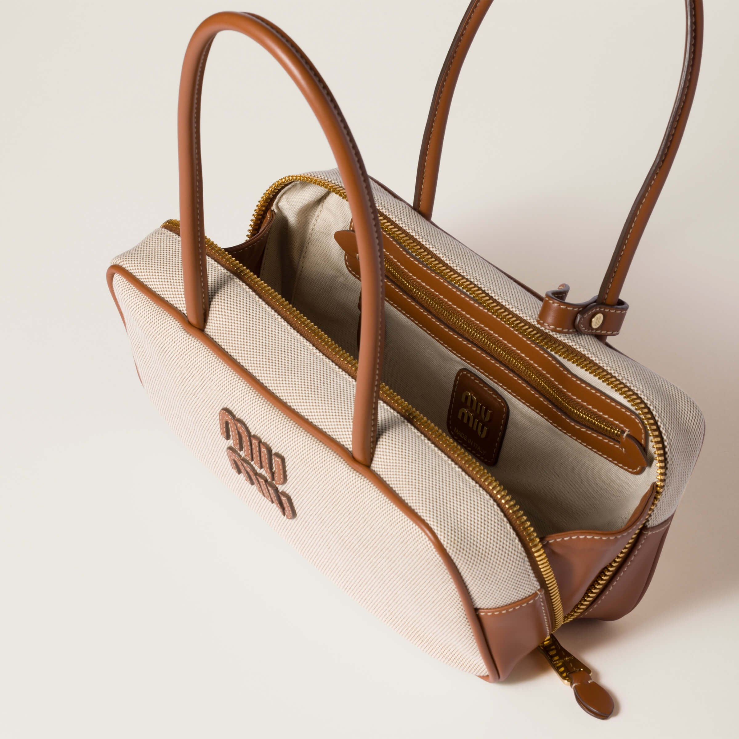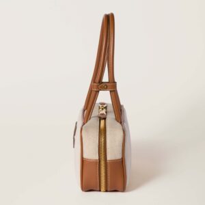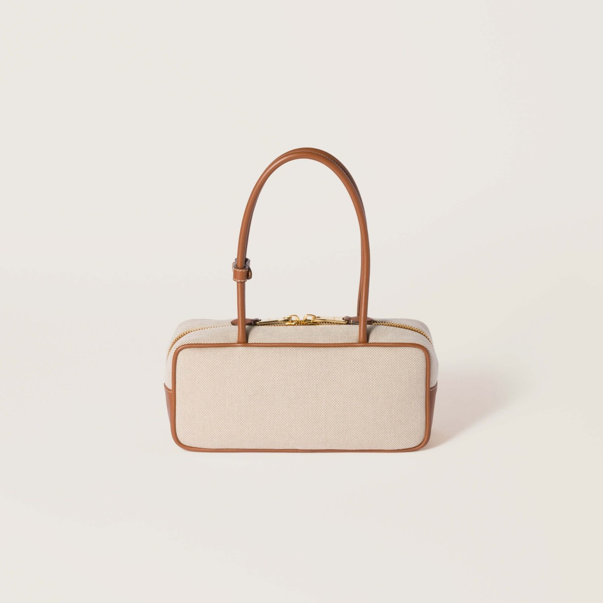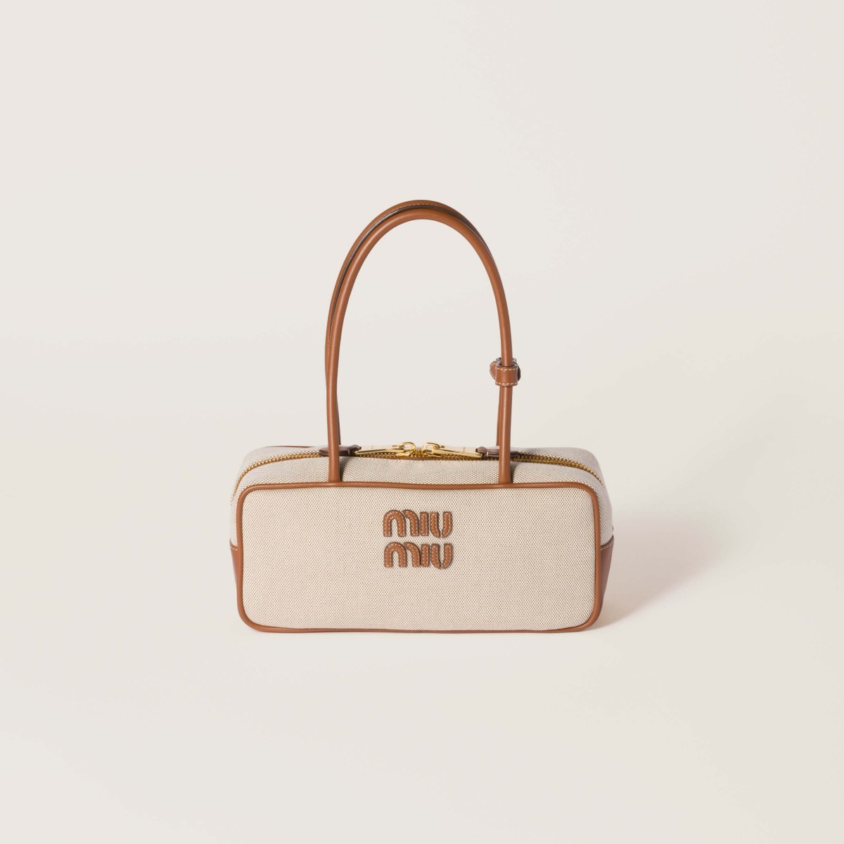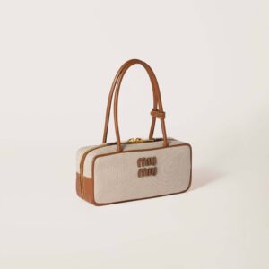 The Miu Miu color-block top-handle baguette handbag is crafted from canvas and leather, featuring gold-tone zipper hardware, top handles, and a 3D brand logo on the front.