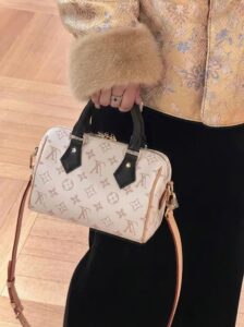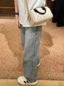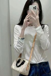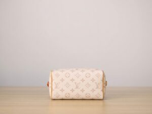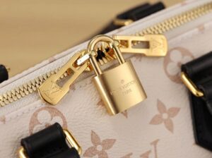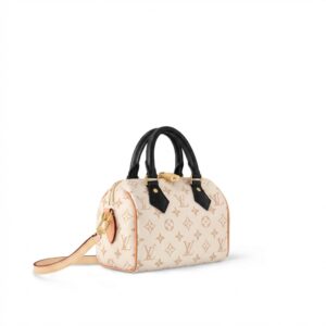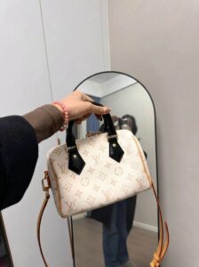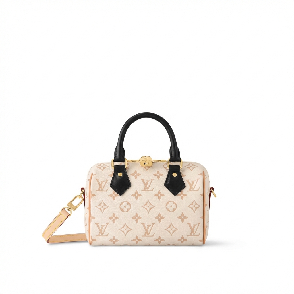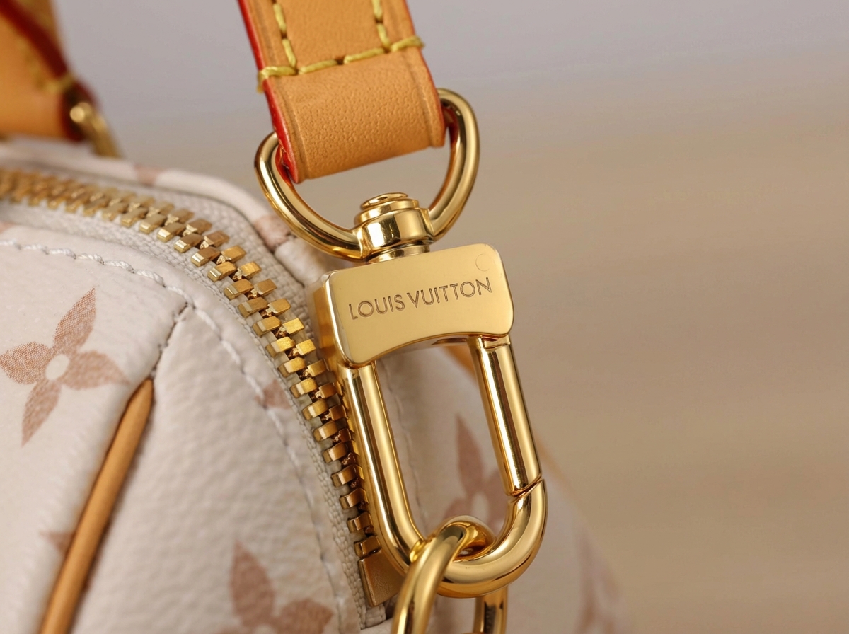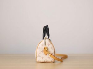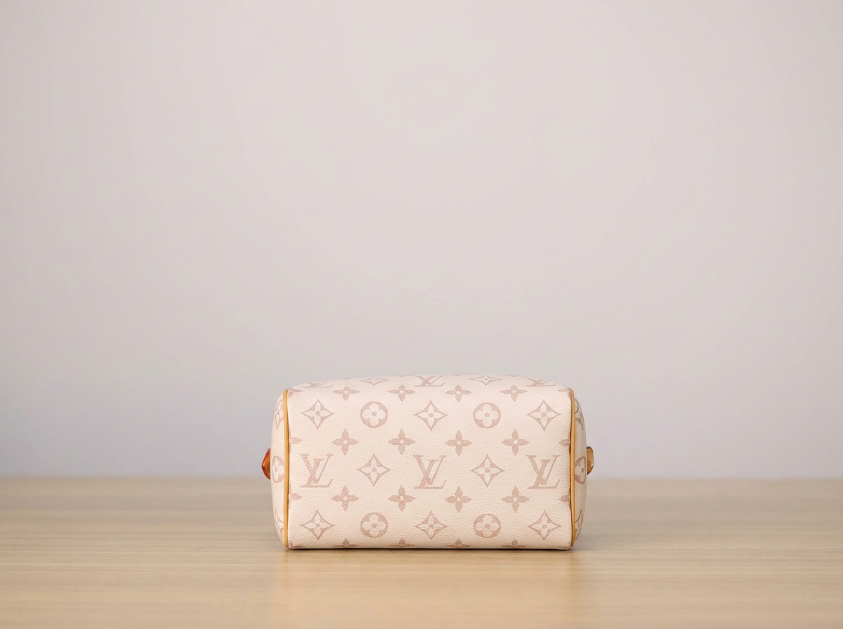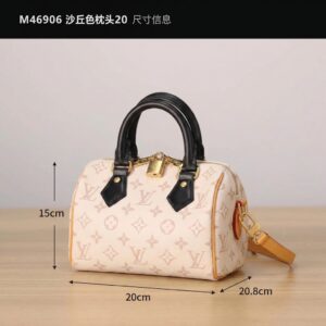 Series: Speedy (Timeless Classic Series) Specific Model: Speedy Bandoulière 20 Color Name: By The Pool Series (White Cement/Cream White with Black accents) Design Background: As a classic travel bag originating from LV in 1930, the Speedy combines a mini 20 size with the fresh By The Pool colorway, perfectly merging vintage travel heritage with modern summer aesthetics, becoming the most popular ‘pillow bag’ today. Core Materials Body Material: Monogram coated canvas (White Cement colorway), featuring light-colored flocked printing on the classic monogram base. The texture is matte and delicate, providing a fresher and more fashionable feel compared to traditional monogram, while being water-resistant, wear-resistant, and scratch-resistant. Contrasting Parts: Black smooth calfskin (handles, bottom protective patches), firm in texture, creating a strong visual contrast with the light-colored body, enhancing overall refinement. Auxiliary Materials and Hardware: Natural vegetable-tanned cowhide (shoulder strap, trim), which will oxidize to a warm honey color with use; shiny gold-tone metal hardware (zipper, lock, rivets), high gloss with a premium feel. Lining: Beige fabric lining, durable, breathable, and soft to the touch. Made in: Handmade in France, Spain, Italy, and other European countries. Dimensions (Size 20, Mini Pillow Bag) Core Dimensions: 20cm × 13.5cm × 12cm Handle Height: Approx. 9cm, suitable for hand carry or short underarm carry. Shoulder Strap: Adjustable and removable vegetable-tanned leather shoulder strap, length approx. 95–115cm, supports single shoulder or crossbody wear. Interior Structure: 1 main compartment (spacious enough to hold a phone, short wallet, lipstick, compact, and other essentials), no additional inner pockets, designed for simple storage. Design Highlights Classic Pillow Bag Silhouette: Smooth rounded body lines, petite 20 size, balancing cuteness and practicality, making it the most suitable mini bag size for everyday use. Contrasting Color Aesthetic: White Cement light monogram paired with black shiny calfskin handles, breaking the dullness of traditional monogram, radiating summer freshness, with high recognizability. Signature Details: Equipped with classic LV padlock (decorative, not anti-theft), black calfskin bottom protection patch effectively resists scratches and wear, prolonging bag lifespan. Versatile Carrying Options: Removable shoulder strap and hand handles allow flexible carrying methods to suit different outfits and occasions. Suitable Occasions Summer Outings: Fresh White Cement colorway suits the beach, shopping, afternoon tea, and other casual scenarios; pairs well with dresses, denim, and vacation outfits, instantly enhancing the summer vibe. Light Office Commute: The mini size is not bulky; paired with light-colored suits and shirts, it creates a sharp yet gentle office look, easily carrying essential personal items. Dates and Social Events: Hand carry provides elegance, crossbody wear offers casual mobility, making it an excellent accessory to elevate date outfits. Short Trips: As a convenient small bag, it can store travel documents, lipstick, power bank, and other essentials, combining style with practicality.