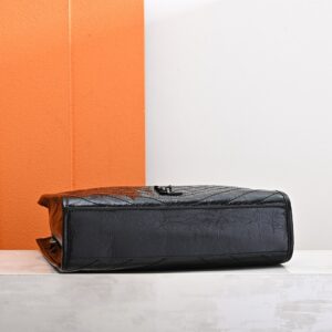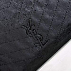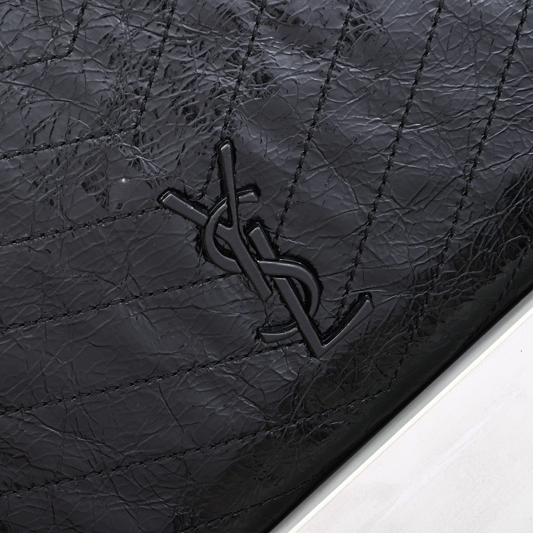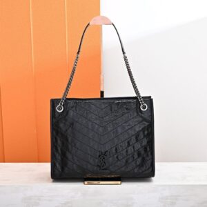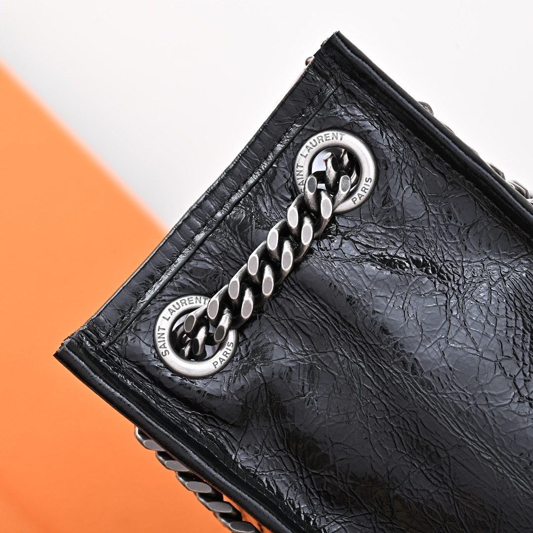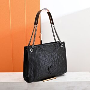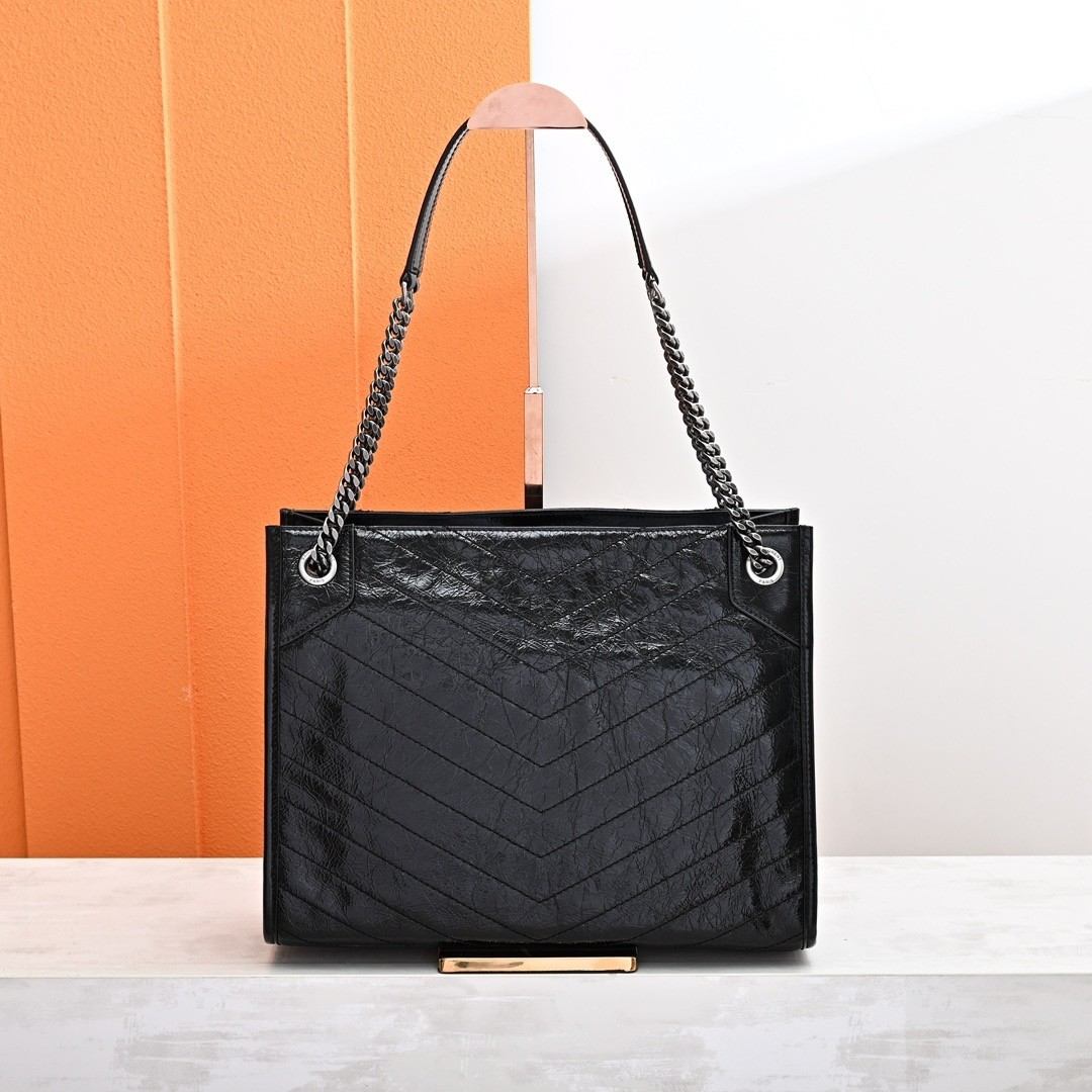 Saint Laurent Niki Shopping black handbag, crafted from vintage crinkled leather, featuring tone-on-tone embossed brand logo and silver chain shoulder strap, a classic retro tote style.